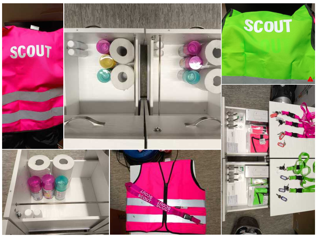 - Mädchentoiletten: Rosa Warnweste, Schlüssel, Rollcontainer mit Sitzkissen
